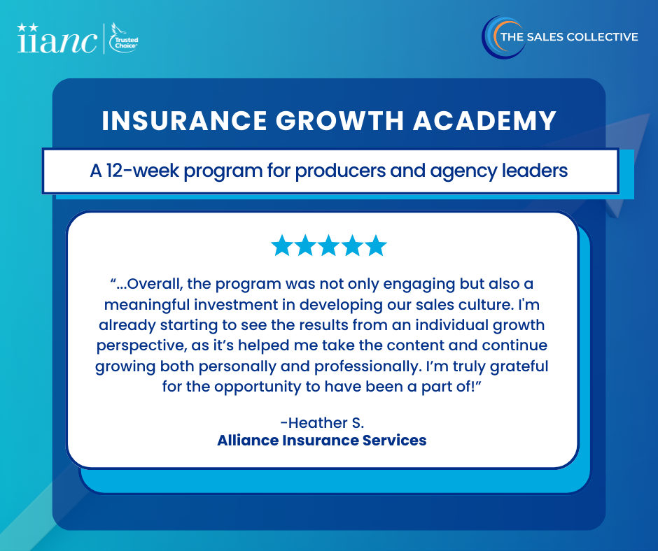 Insurance Growth Academy, offered in partnership with The Sales Collective, is a training experience featuring live Zoom sessions, built for insurance producers who are committed to scaling performance and building stronger client relationships.